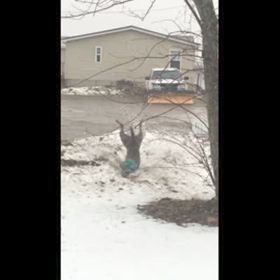 A running dog face plants in the snow and keeps on running.