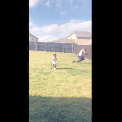 A young boy and a man balance on a brick fence next to a yard. The man loses his balance and falls backwards, disappearing behind the fence.