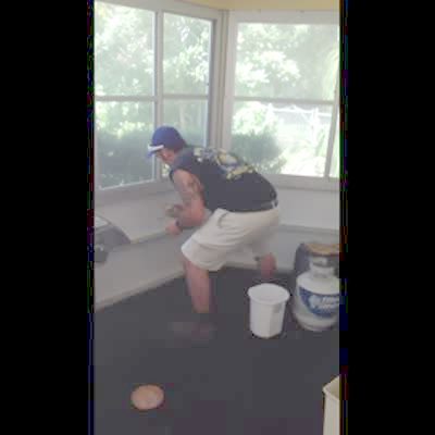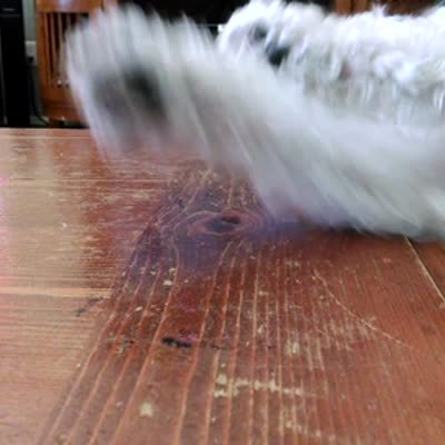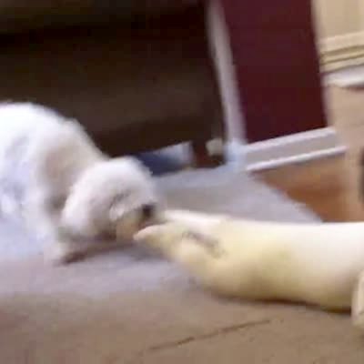 "The Out of Reach Treat" A Bichon Frise dog frantically scrambles to reach a chip on a table at home when a much larger black dog walks up and eats it.
