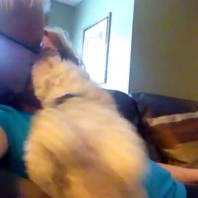 A white Bichon Frise dog tries to put itself between a man and a woman kissing at home.