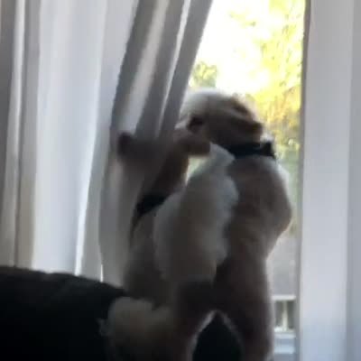 Two Bichon Frise dogs look out the window and bark at home, then a woman gasps loudly and says "oh my gosh, America's Funniest Home Videos is on." They turn around and run toward her.