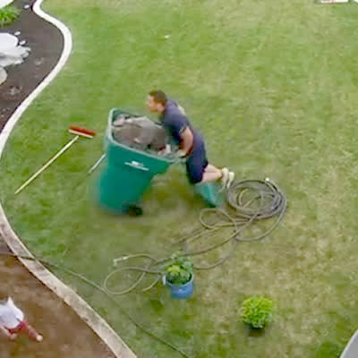 A woman rushes to get his trash can out on trash day, when she yanks at the bin and it falls on top of her and pours rain water all over her while she sits in a yard. Security footage.