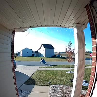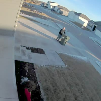 A man and a woman take the garbage cans up the driveway but the wind is so strong that the lid hits the wife in the head and she falls down. Security Footage.