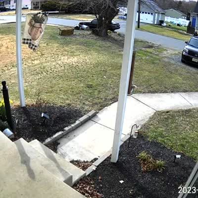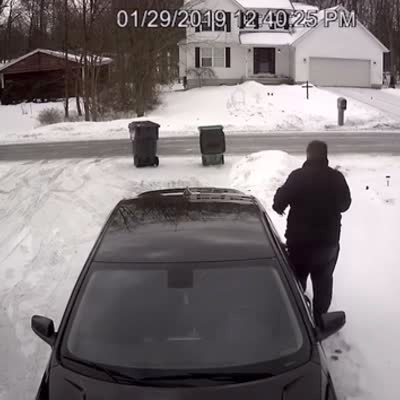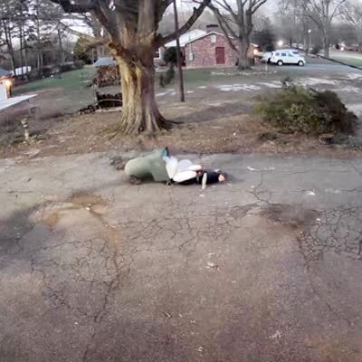 A man walks down an icy driveway to get his trash when he slips and falls onto his back. Security footage.