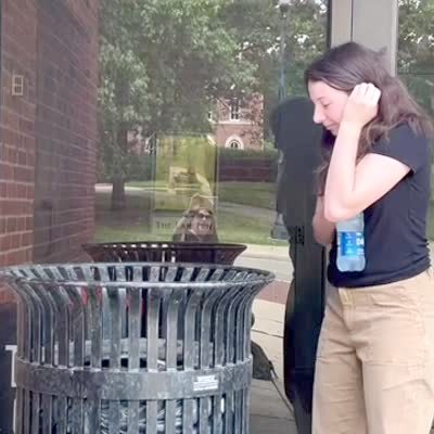 A young woman stares into a trashcan. Suddenly, a squirrel flies out.
