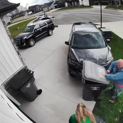 "Garbage Can Klutz" A senior man starts to wheel a garbage can down his driveway, then it falls on him, and he calls to his wife for help. Security footage.
