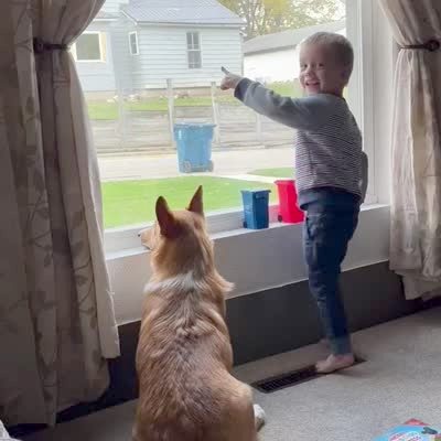 A young boy looks out the living room window and sees a garbage truck. He jumps up and down, claps and shouts, "There he is! He's coming today!" The truck dumps the garbage can and the tot boy claps his hands.