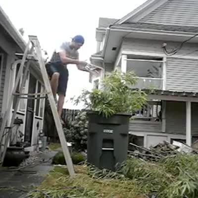 A young man jumps from a ladder into a trash can full of bush trimmings in the yard to pack them tighter into the trash can, but when he lands in it, the trash can tips over and he falls.