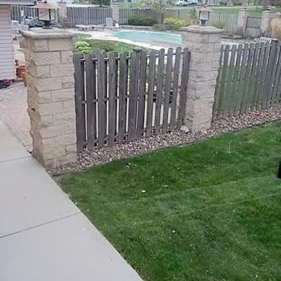 A woman drives a lawnmower up his driveway but she forgets to park it. She falls off and the lawnmower reverses into some trash cans. Security Footage.