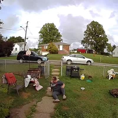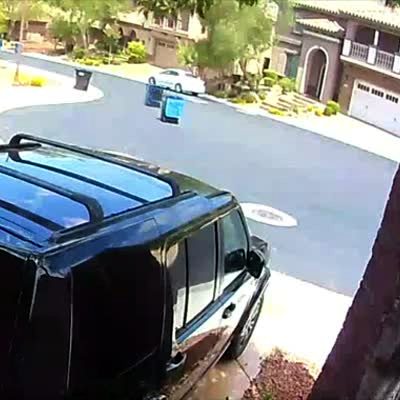 A man rolls a garbage can up the driveway and the lid blows up and hits him in the face. Security footage.