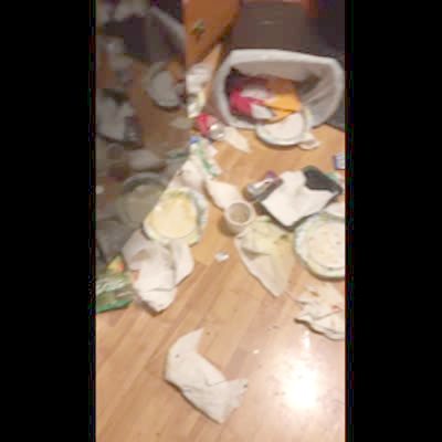 The house is a mess with garbage all over the floor. A dog sits in the garbage can in the kitchen.