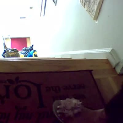 A woman takes out the trash and tumbles off of the edge of a porch. She then, nonchalantly, walks back inside of a home. Security footage.