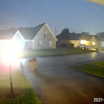 A trash can at the end of the driveway slowly slides away due to heavy rain. Security footage.