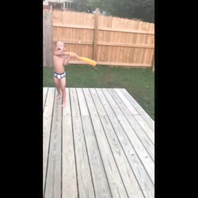 A tot boy stands on a deck patio, ready to hit a wiffle ball with a toy plastic bat. He swings the bat as a German Shepherd dog jumps in front of him and tries to catch the ball in slow motion.