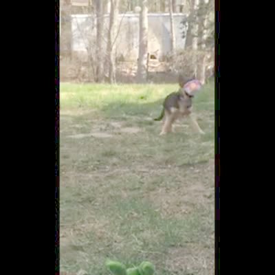 A German Shepherd gets its head caught in a screen door. The dog drags it into the yard. Security footage.
