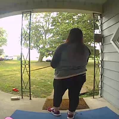 A woman films her broken glass front door while her tot son tells her he tried to hit a bee with a rock.