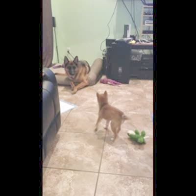 A puppy dog barks at a German Shepherd dog, who is laying in a bed. The puppy continues to bark, but yelps and runs away when the German Shepherd stands up.