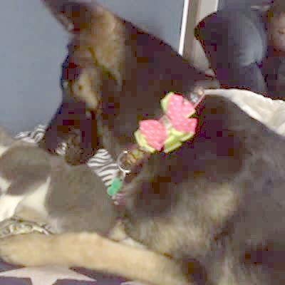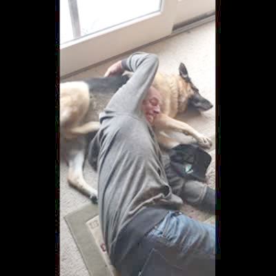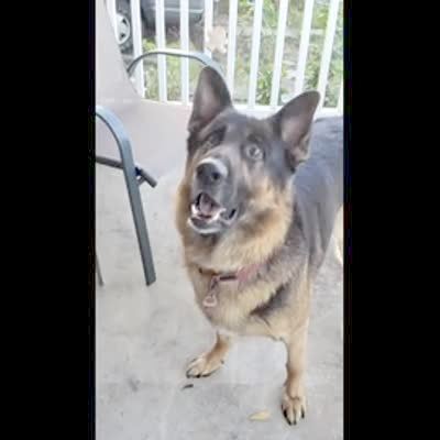 A German Shepherd dog whines and moans as a woman tells the dog that she loves her.
