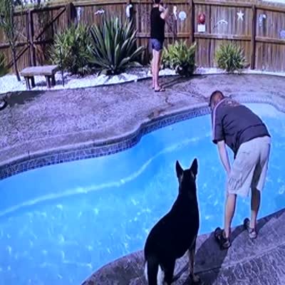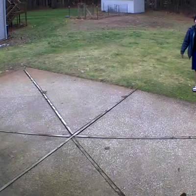 A man in a yard bounces a tennis ball off the roof of the house. A German shepherd dog on leash runs after the ball, and the woman who holds the leash falls down. Security footage.