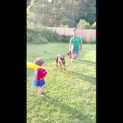 A german shepherd dog jumps in front of a tot girl and grabs a plastic baseball out of the air when her father throws it to her.