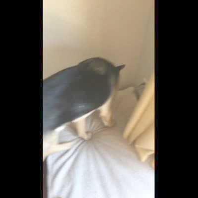 "Sheepish Shepherd" German shepherd dog hides in shower stall, ignores man after tearing up bed sheet. Looks very guilty while man questions him.