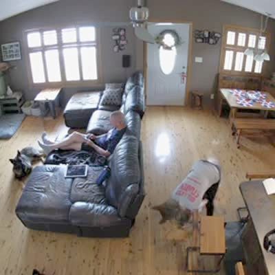 When man tells a dog "you are getting very sleepy" the dog closes its eyes and starts to sleep but then the man says "go for a walk" and the dog opens its eyes and looks at him. He does this several times. Living-room.