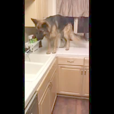 A woman tells her German Shepherd dog to get off the kitchen counter, then turns the camera to her cat and asks if it made the dog jump on the counter.