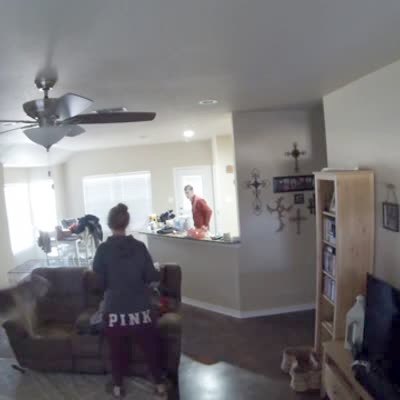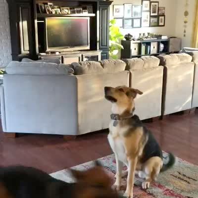 Two German Shepherd dogs watch a drone toy fly and one dog jumps and bites it and a woman screams in a living room.