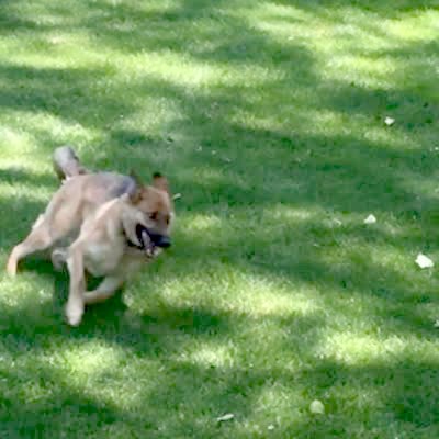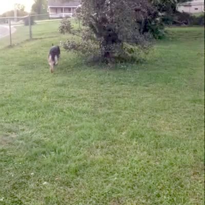 A German Shepherd walks around on a leash attached to an aerial dog run outside. The least gets caught on a toy car which causes it to moving seemingly on its own. The dog becomes scared and runs away, barking, causing the toy car to chase after him and fly threw the air. Security footage.