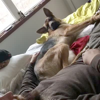A German Shepherd dog kicks a man in the throat when the man tickles his paw and he laughs in a bedroom.