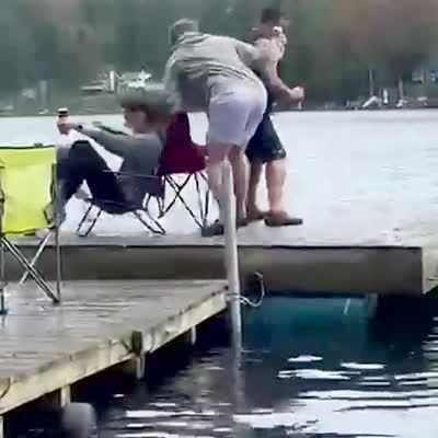 Two men and a woman play musical chairs on a platform in the water. A German Shepherd dog decides it wants in, and enters the platform. The music stops and one man struggles to enter the chair, and he pushes it to the corner of the dock. The corner sags under the weight, and just as the man takes his seat, he falls backwards into the water. The German Shepherd swims out to him.