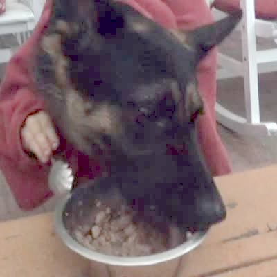 A German Shepherd dog eats a bowl of dog food with human hands at a table in a yard.