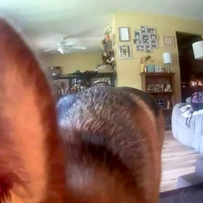 A German Shepherd dog bites a Ring security camera outside the house. Security footage