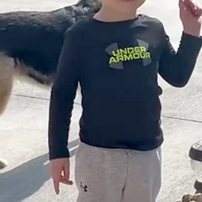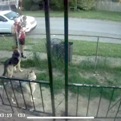 A man carries his tot boy into a fenced in yard, and his German Shepherd runs out of the fence. He puts the boy down in the yard, then the boy opens the gate and lets a Husky dog out while the man chases after the German Shepherd. Security footage.