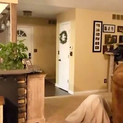 A man throws a toy for a German Shepherd dog and hides under a blanket in a living room, then the dog runs back and forth through the house with the toy in his mouth.