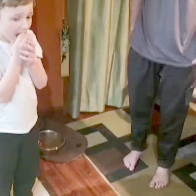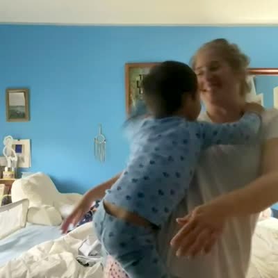 A woman picks up a tot boy to do the "koala challenge" and holds him at her side in a bedroom, but a German shepherd dog jumps up and takes the tot boy's pants off.