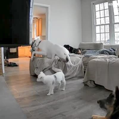 A German shepherd puppy jumps off of a living room couch, but the dog hits his face on another part of the couch. Security footage.