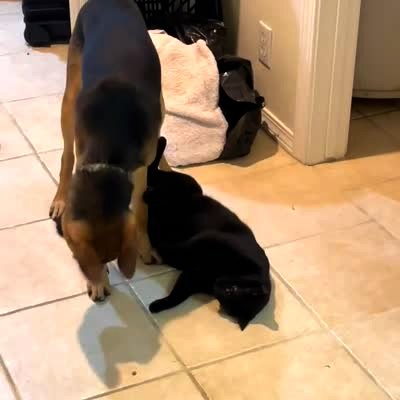 A cat and dog play and wrestle in a kitchen. Then the dog sits on the cat's head.