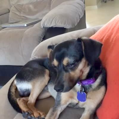 A German Shepherd dog spits a bagel out of its mouth on a dog bed after a woman asks it what's in its mouth.