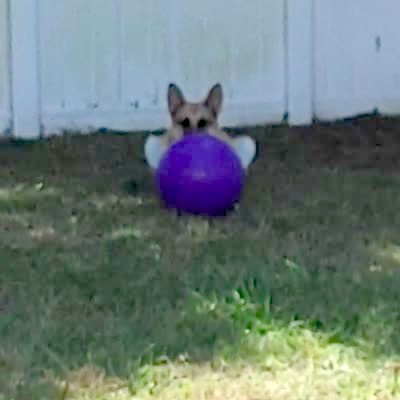 A German Shepherd "hides" from his owners behind a purple ball in the yard.