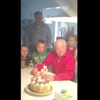 An old man's false teeth fall out at :43 while he tries to blow out the candles on his birthday cake. His grandchildren stare while the adults laugh.