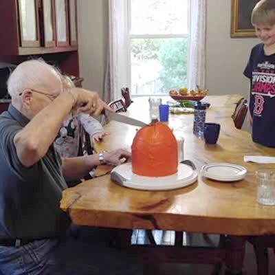 A young boy and a young girl prank their grandfather with a balloon cake.