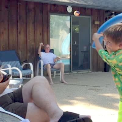 A young boy throws a baseball back to his grandfather and hits him in the face making him fall backwards onto the couch. When he finally recovers and gets up, the grandson applauds him like an injured player walking off the field. Security footage.