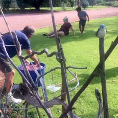 A grandfather walks through a backyard with a plate of food in tin foil and pretends to drop the food but trips and accidentally falls down. A teen boy helps him up and tells his grandfather he meant for him to just drop the food and not fall, and his grandfather laughs and asks if the boy thinks they got it.