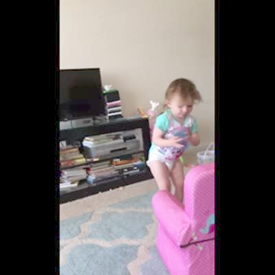 A young girl lies on a giant bean bag chair. A man and woman jump on it and launch her into the wall.