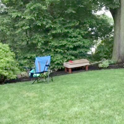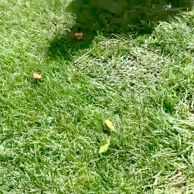 A tot girl and boy search for eggs in the backyard. Their grandfather watches the kids but doesn't watch where he steps. He falls into the pool.