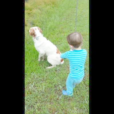 A grandfather tells a young boy that cattail plants in a yard are corn-dogs and he picks them off the plant and laughs.