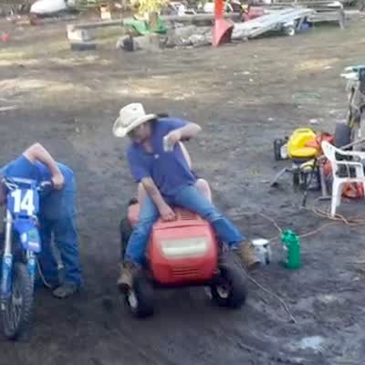 A young boy drives a lawnmower and his grandfather rides on the front and then falls into a puddle of mud and laughs in a yard.