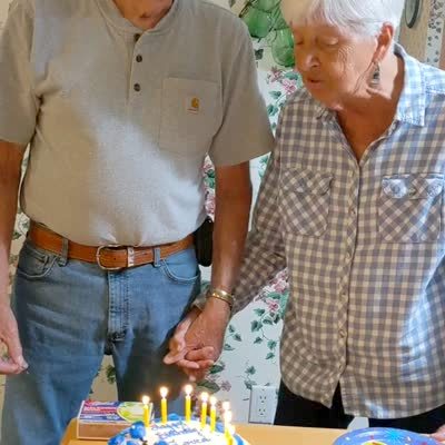A family sings Happy Birthday to a senior man and woman in front of a birthday cake in a home. A woman tells the senior man to make a wish and the senior woman says "Oh no, not again tonight" and their family laughs.