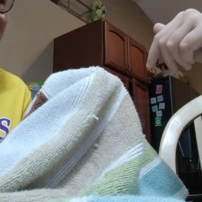 A young girl puts a rag over a cup of water and bets her grandma that she can drink it and not touch the rag. She then makes a hand gesture and tells her grandma to check. The woman lifts the rag, and the girl takes the cup and drinks the water.